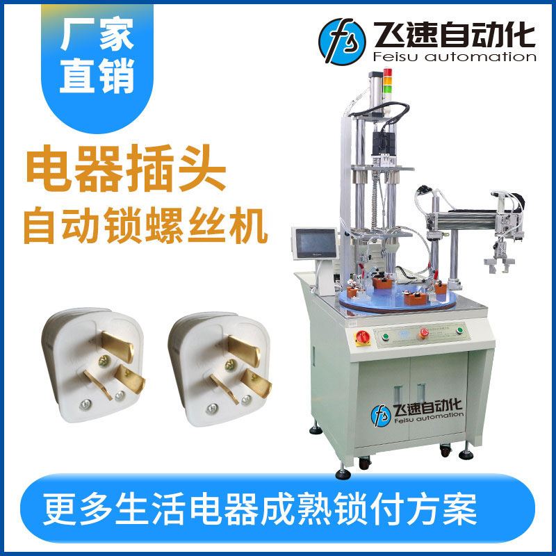 電源插頭作為一種日常用品,在生活中被廣泛使用。因此它的使用安全性也越來越引起人們的重視?,F(xiàn)在常用的電源插頭由于為了便于插腳能順利的插入到插座的插孔中,一般是插座的插孔的內徑大于插腳的外徑并且插孔的絕緣上蓋上設置有倒角。但是這種結構也帶來了安全隱患。因為在插孔的絕緣上蓋處,插腳與插孔的內壁之間存在著一定的縫隙,在插頭的插拔過程中,很容易從縫隙中帶入雜質,引起短路,更危險的是,小孩有可能將手指伸入到縫隙中,有著觸電的危險,在生產中需要螺絲來緊固內部的螺絲,傳統(tǒng)手工放置螺絲和對準螺絲頭部仍需要占用大量的工作時間和精力,因此整體效率提升比較低,有而且很容易滑牙擰不緊等問題造成產品質量差,廠家會考慮到電動螺絲刀或者氣動螺絲刀擰緊兩種,后者通過電動或者氣動的方式產生旋轉動力,以代替頻繁手工的擰緊動作,雖然在生產上堅強了勞動的強度,但仍然存在生產效率得不到提升。 飛速自動化提供一臺機械手轉盤式自動擰螺絲機通過配置轉臺和機械手臂,由設備一次擰好多顆螺絲,擰好螺絲的產品由機械手臂抓起并放入流水線,設備可實現(xiàn)多軸擰螺絲、取放產品 、送螺 絲、員工放置工件等多工位同步圓周作業(yè),生產效率極高。 機械手轉盤式擰螺絲機詳細介紹 省人工,流水線專用,配置機械手和轉盤,實現(xiàn)供料、檢測、鎖付、取放產品同步作業(yè),并由設備自動完成,節(jié)省大量人工; 效率高,多把電批同時工作,可代替多名工人。電批數(shù)量可根據(jù)客戶要求定制; 易操作,傳統(tǒng)的手工取螺絲和對準螺絲孔需要占用大量的工作時間和精力,只需不停放置工件; 智能化,PLC智能電路控制.配置觸摸屏,操作簡單,員工只需放置工件即可; 高標準,鎖付工序完全由設備按程序自行完成,避免人工誤操作帶來的不良影響; 性能穩(wěn),關鍵部位采用高品質五金材料并經過特殊處理,電子原器件采用原裝進口。