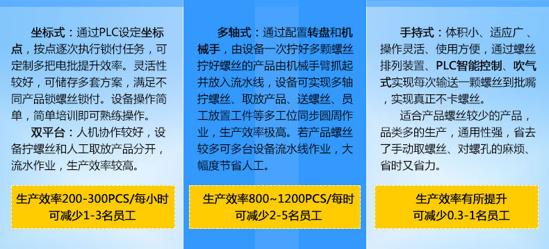 - 產(chǎn)品簡(jiǎn)介: 手持式自動(dòng)鎖螺絲機(jī)也叫手持式自動(dòng)螺絲機(jī)、自動(dòng)供料鎖螺絲機(jī)、自動(dòng)打螺絲機(jī)、自動(dòng)擰螺絲機(jī)等,嚴(yán)格來(lái)講,手持式只能算是半自動(dòng),因?yàn)樗€是需要手工操作。一臺(tái)手持式自動(dòng)鎖螺絲機(jī)主要由兩部分組成:自動(dòng)供料機(jī)和電批,其中自動(dòng)供料機(jī)是主重要的,也是復(fù)雜的,它的好壞直接關(guān)系到機(jī)器卡不卡料的問(wèn)題。
